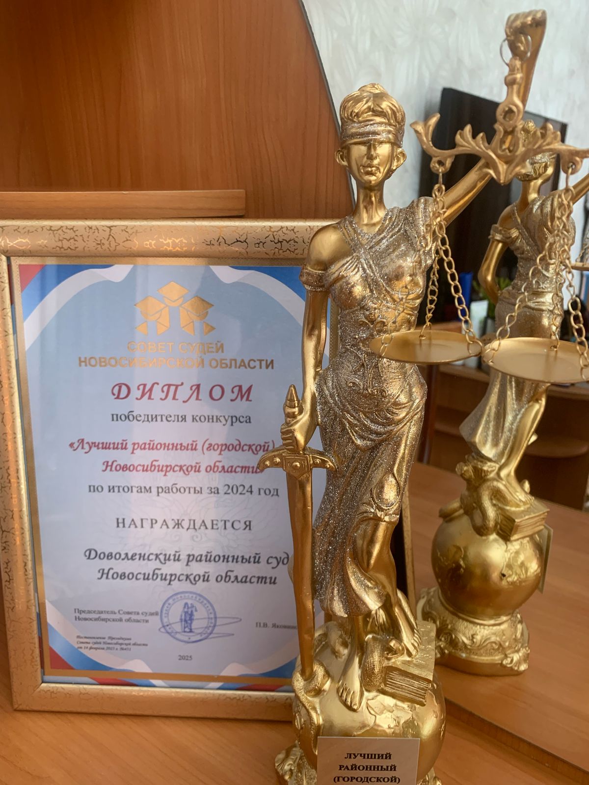 На совещании по итогам работы за 12 месяцев 2024 года, которое состоялось в Новосибирском областном суде 14 февраля 2025 года на основании ряда критериев, лучшим районным судом признан Доволенский районный суд. При выборе победителя учитывали сроки и качество рассмотрения дел, аналитическую работу, нарушения и недостатки в деятельности районных (городских) судов, участие в общественной жизни судейского сообщества Председатель Совета судей Новосибирской области Павел Валерьевич Яковинов вручил переходящий почетный приз «Фемида» и Диплом победителя конкурса «Лучший районный суд Новосибирской области» по итогам работы за 2024 год исполняющей обязанности председателя Доволенского районного суда Новосибирской области Буяновой Наталье Александровне. Председатель Новосибирского областного суда Людмила Викторовна Симанчева поблагодарила Наталью Александровну за проделанную работу и отметила, что поставленные цели и задачи успешно реализованы.