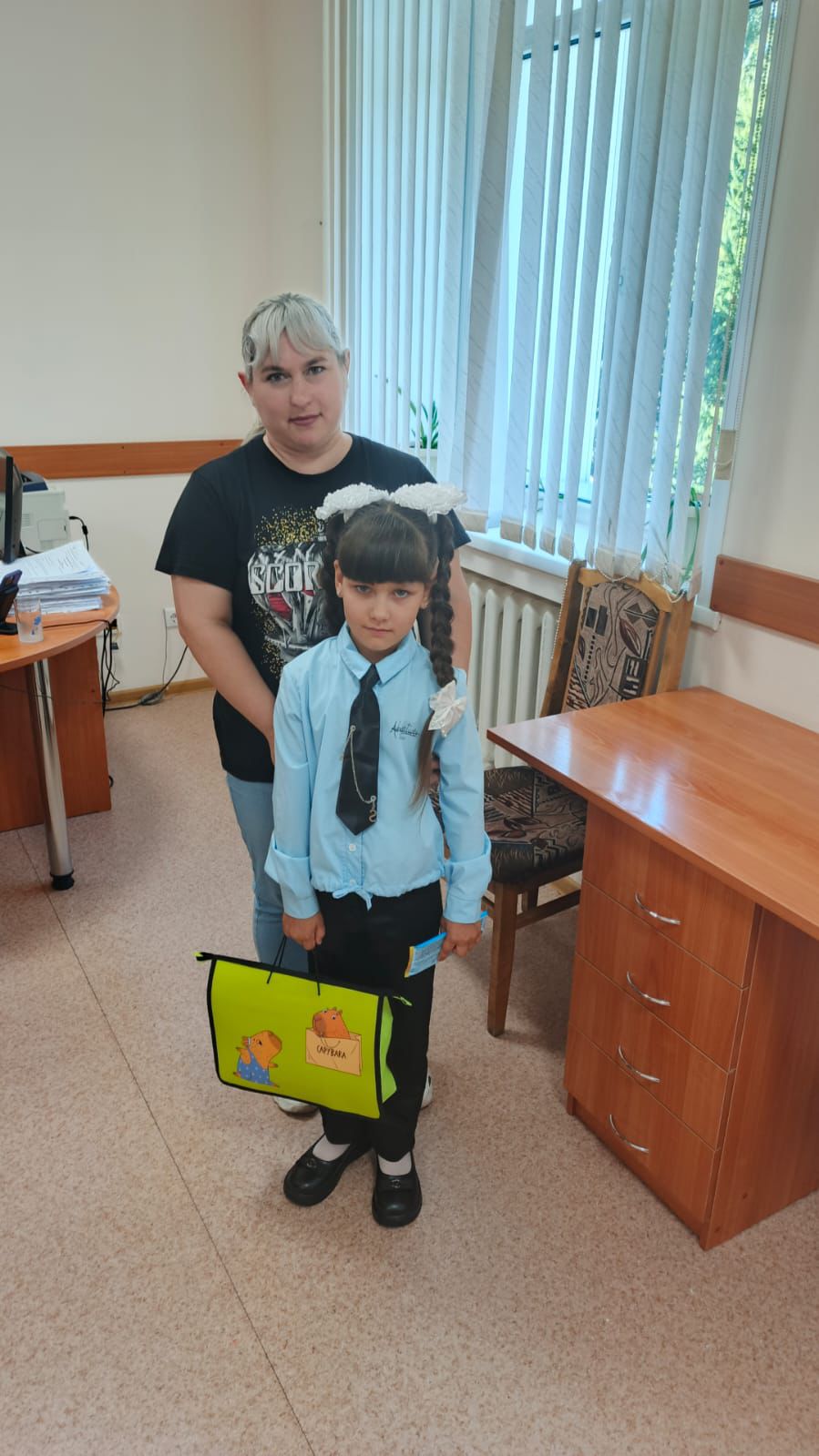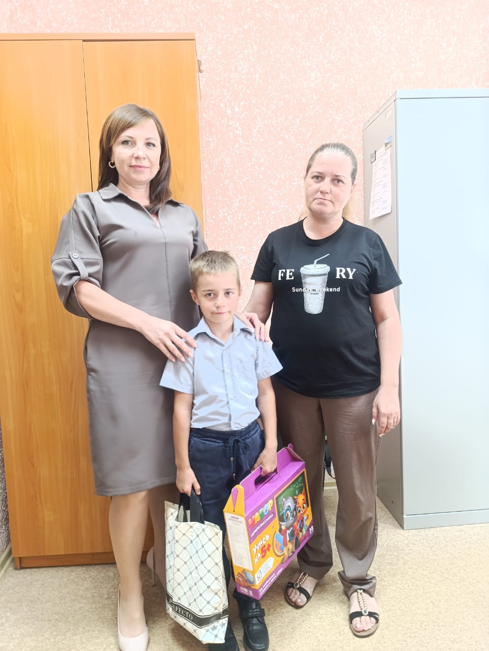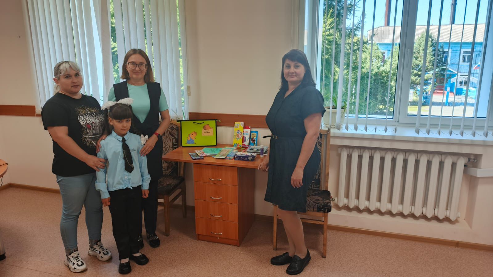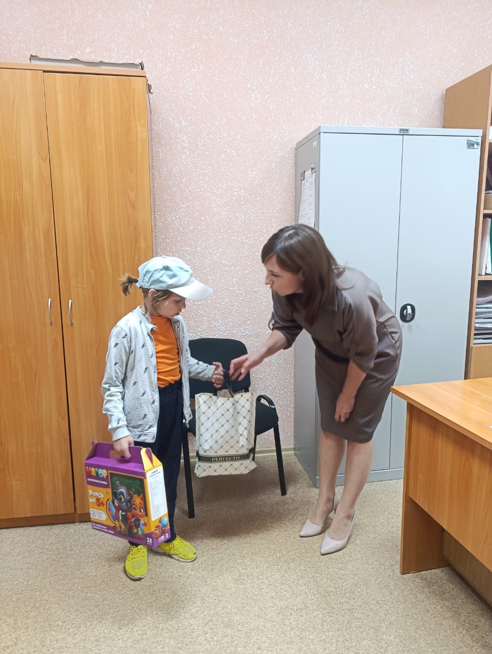Судья Доволенского районного суда Лариса Анатольевна Шелигова и секретарь судебного заседания Евгения Сергеевна Сарапулова вручили Орда Регине подарок, в котором было все необходимое для успешной учебы в школе, а так же сладости для хорошего настроения. Подарок был вручен в торжественной обстановке с добрыми пожеланиями, чтобы школьная жизнь стала одним из самых счастливых воспоминаний детства, а школьная дорога была легкой и успешной.
