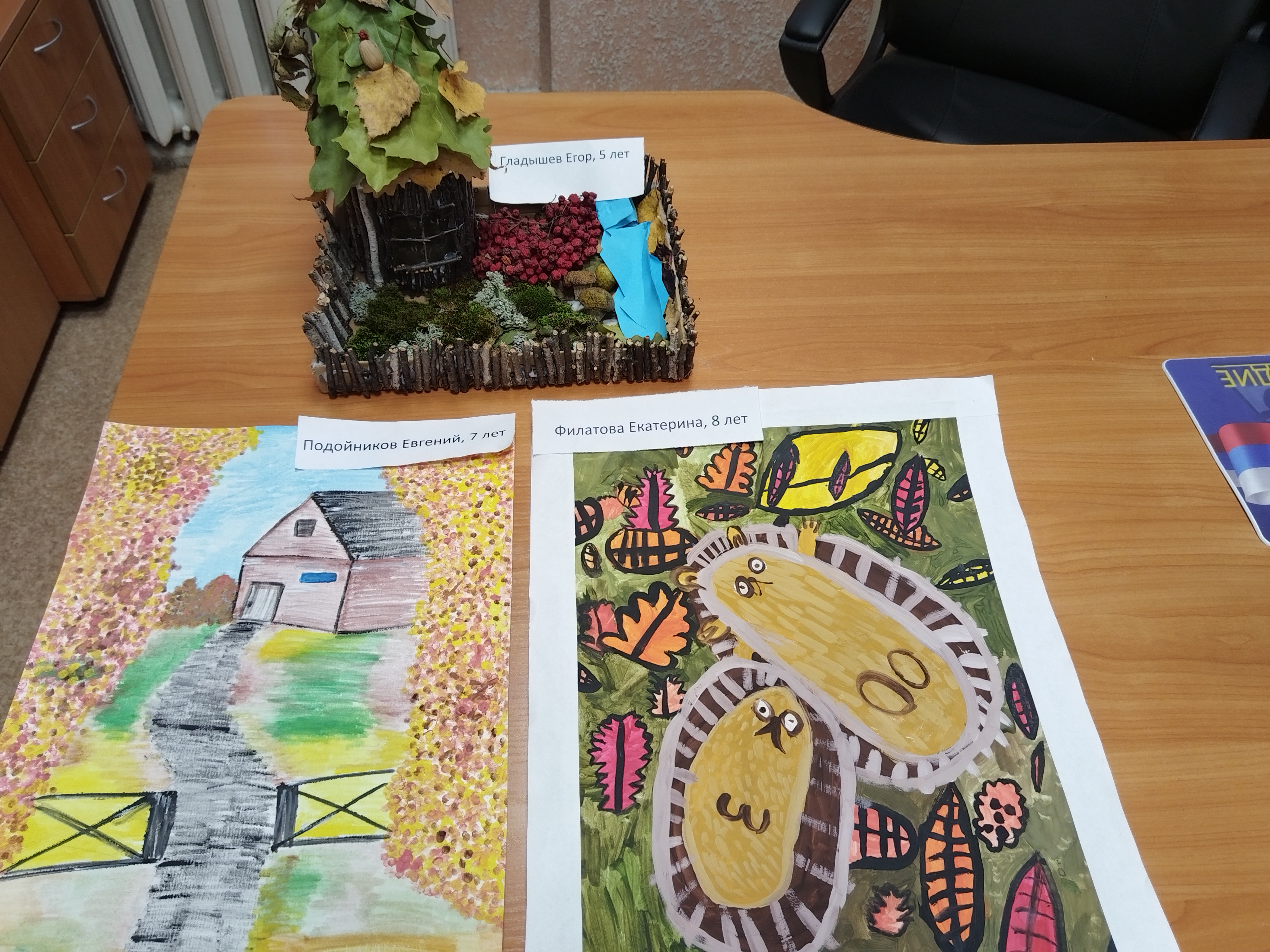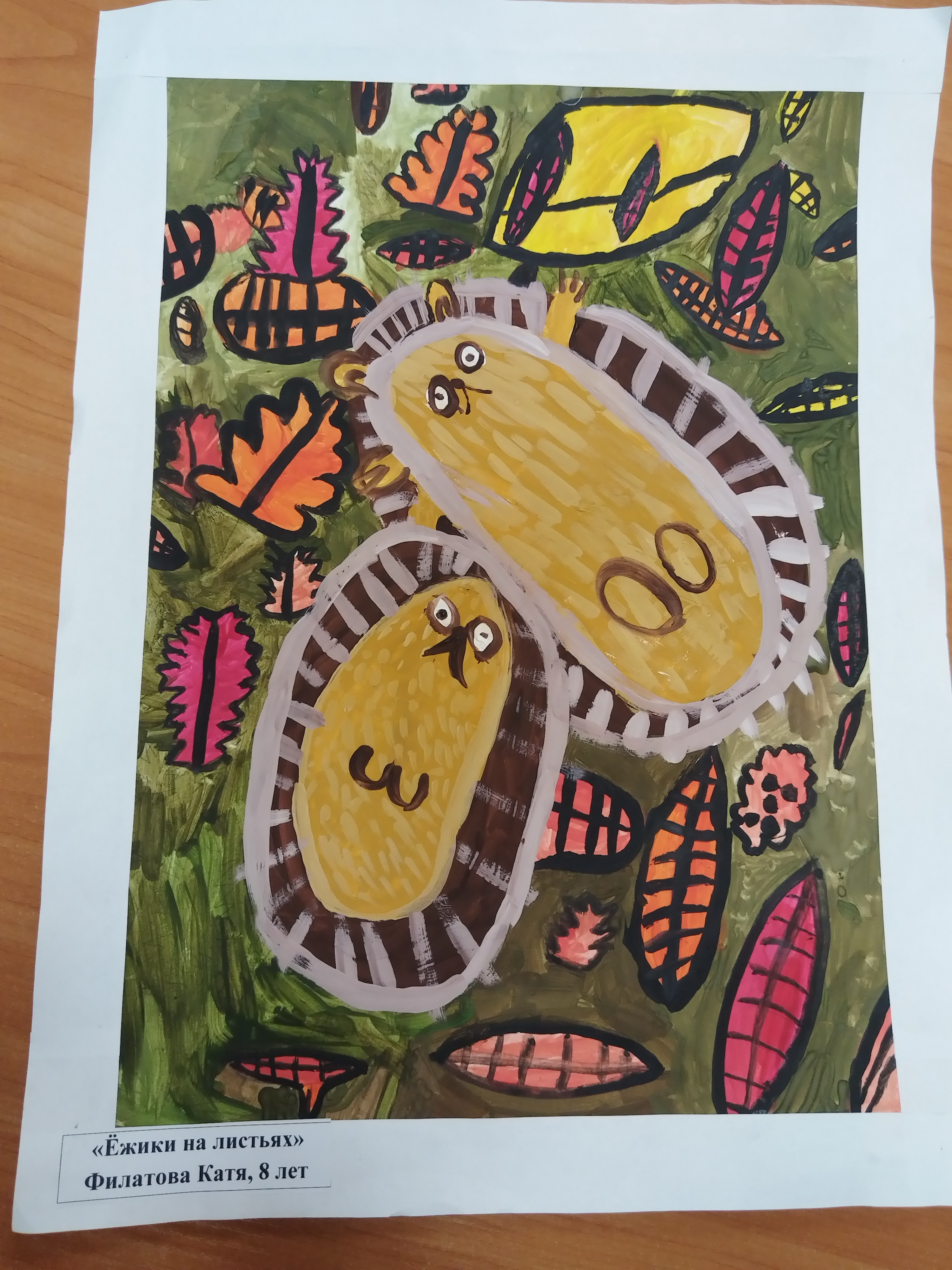 … Осень – у многих любимое время года. Медленно кружась в воздухе, падают и падают с деревьев лёгкие, невесомые жёлтые листья. От дерева к дереву протянулись тонкие серебристые нити лёгкой паутины. Ещё цветут поздние осенние цветы. Прозрачен и чист воздух, шелестит под ногами опавшая листва, дышится легко. Одним словом «Волшебный мир осени»… Золотая осень — это прекрасное время для творчества: природа сама предлагает нам красочный и интересный материал для вдохновения. … Поэтому с наступлением осени традиционно дети сотрудников Доволенского районного суда приняли участие в выставке-конкурсе «Краски-осени», представив на выставку работы, выполненные своими руками. На выставку представлены творческие работы: - Картина «Ежики на листьях» Филатовой Кати, 8 лет (дочь помощника судьи Филатовой А.Г.)