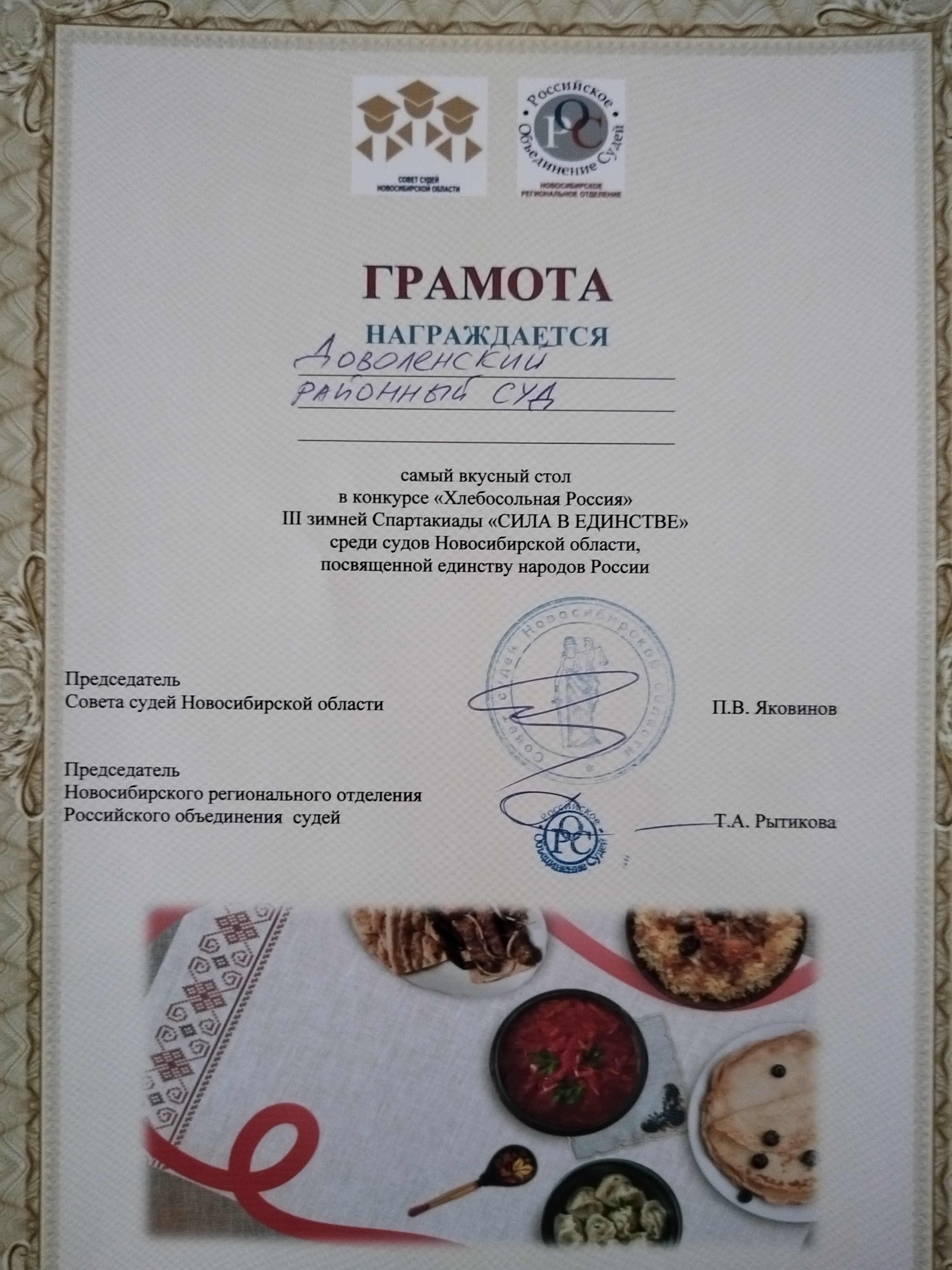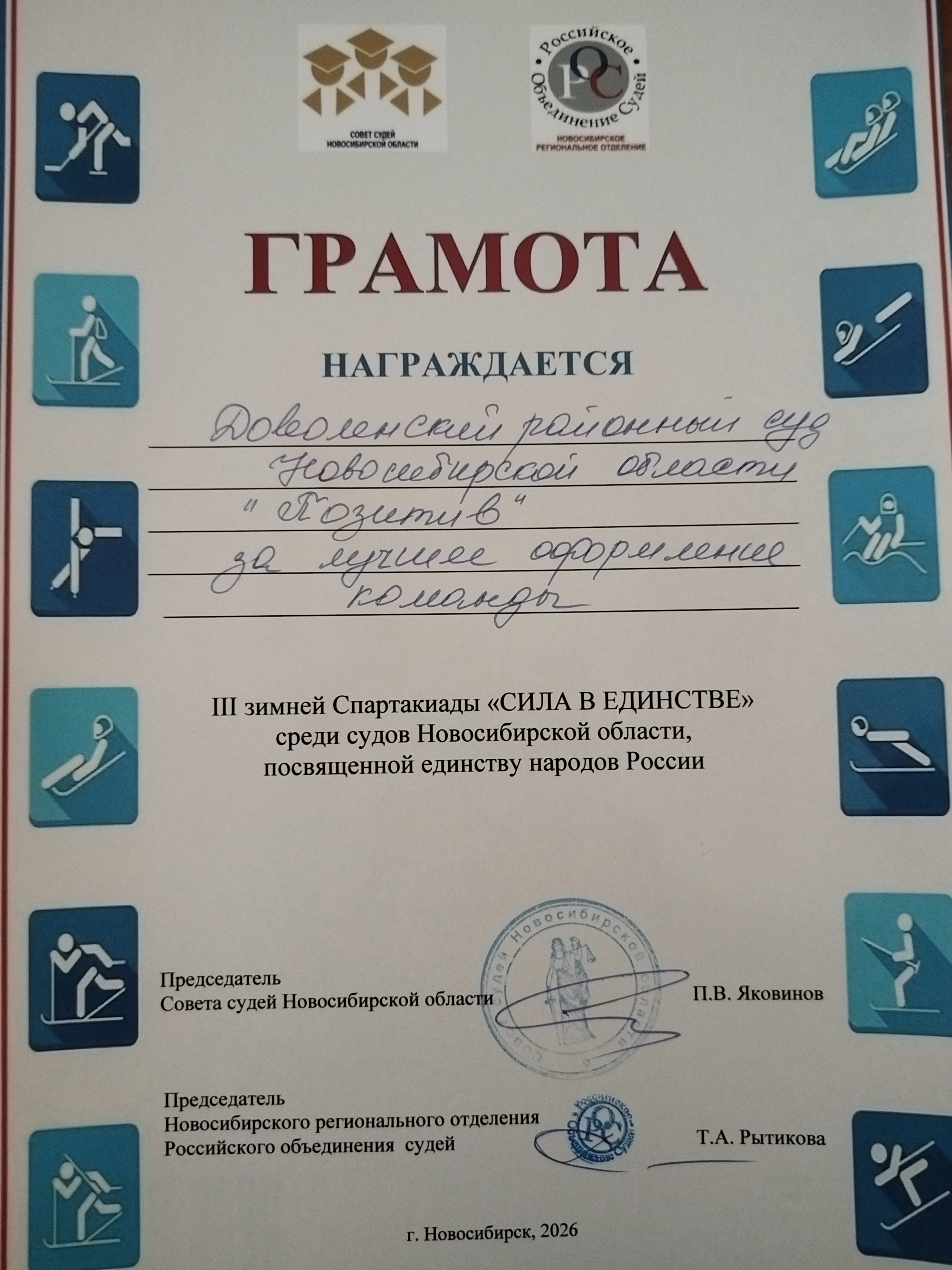 14 марта 2026 года команда Доволенского районного суда Новосибирской области «Позитив» приняла участие в Третьей зимней Спартакиаде средисудей и сотрудников судов Новосибирской области 2026 года, организованной Советом судей Новосибирской области и НРО ООО «Российское объединение судей». Команда «Позитив» приняла участие в спортивных дисциплинах: лыжная эстафета «Гонка друзей», эстафета «Битва богатырей», эстафета «Снежные выкрутасы». Судьи и сотрудники аппарата Доволенского районного суда проявили активность, сплоченность и настоящий дух соревнования. В различных конкурсах они продемонстрировали не только спортивные навыки, но и командный дух, поддерживая друг друга на каждом этапе. Огромная благодарность всем участникам за их энергию и участие! Такие мероприятия помогают не только развивать физическую активность, но и укреплять дружеские отношения между сотрудниками судов Новосибирской области. Мы уверены, что подобные соревнования способствуют созданию отличной атмосферы и хороших воспоминаний для всех участников! Команда Доволенского районного суда награждена грамотой Совета судей Новосибирской области и НРО ООО «Российское объединение судей» за лучшее оформление команды. Кроме того, команда «Позитив» награждена за самый вкусный стол в конкурсе «Хлебосольная Россия» III зимней спартакиады «СИЛА В ЕДИНСТВЕ» среди судов Новосибирской области, посвященной единству народов России.